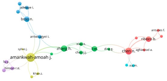 Figure 6 graphically displays collaborative network based on co-authorships of the principal authors. As in Figure 5, the colour of the circle corresponds to the cluster that groups the authors and their main collaborators. The red circle comprises Aghaeirad, A. together with Antunes, F., Chen, A., Chen, N., Pereira, F. and Ribeiro, B. The green circle also includes six authors: Beaverstock, J., Chen, J.J., Ding, G., Li, W., Xiao, X. and Zhang, H. The association in blue consists of five authors, Adeleye, I., Antwi-Agyei, I., Boson, N., Donbesuur, F. and Gyensare, M. Moreover, in yellow is the group composed of Amankwah-Amoah, J., Khan, Z., Syllias, J. and Wood, G. The fifth cluster, in purple, groups together Hinson, R.E., Honyenuga, B. and Lu, Y. Finally, the sixth cluster, in light blue, is formed by Xia, M. and Xu, Z.