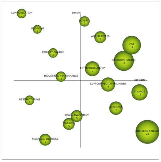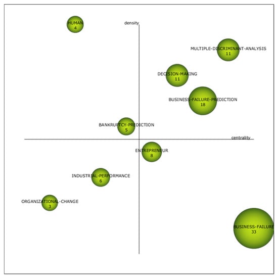 The driving themes, which in the diagram are in the upper right quadrant, are the well-developed and essential themes for the construction of the scientific field [93]. In this first subperiod, multiple discriminant analysis, business failure prediction and decision making presented a high density and strong centrality. The position of these three areas should not be surprising, since the first years of research on business failure focused on predicting financial insolvency. Initially, research was conducted with a univariate analysis approach [65] and subsequently using multiple discriminant analysis [48,71,78], a methodology for predicting business failure. Likewise, the study of the determinants of business failure led to decision making to avoid this scenario. As shown in Figure 7 and Table 10, this term has a high incidence, with 1108 citations.