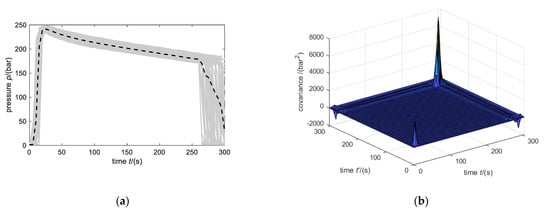 Figure 11 shows the manipulated training set of the pressure lines (gray lines), the approximated mean (dashed black lines), and the computed covariance matrices (surface plots). The peaks of the covariance matrices in Figure 11b,d result from the large variances at the beginning and towards the end of the lines. It must be noted that the pressure lines in these areas do not exhibit a Gaussian behavior. This might lead to weak anomaly detection, as the assumptions do not hold. In order to have a proper Gaussian process that can be evaluated at any time t, the covariance function is approximated by a linear interpolation scheme of the sample covariance matrix. To ensure that the resulting covariance matrix is always positive definite, the main diagonal is decreased by the smallest eigenvalue if it is negative.
