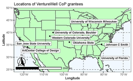 VentureWell (VW) aims to support faculty and students in developing innovations to make positive social and environmental impacts. To that end, VentureWell provides grants to faculty (“Faculty Grants program”) to support the development of educational innovations. In spring 2019, VentureWell piloted the explicit inclusion of sustainable design into the request for proposals (RFP). The RFP sought applications from faculty seeking to develop new courses or programs, or strengthen existing courses or programs that focus on the incorporation of principles and frameworks of sustainability, with the end goal of novel sustainable designs and/or sustainable technologies. Following an external review process, eight faculty grantee teams were selected from the applicant pool from institutions from across the country and across disciplines including design, engineering, and geology (Figure 1).