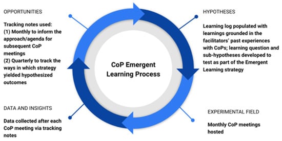 Emergent learning is an iterative framework where independently operating individuals develop and test strategies toward accomplishing a shared goal and through dialogue and interaction, they realize solutions to seemingly insurmountable challenges []. An emergent learning approach was utilized for facilitators to explore the question: “What will it take for faculty to learn from each other through a CoP-and for them to apply that learning to foster systems-level change at their university?”