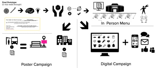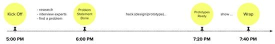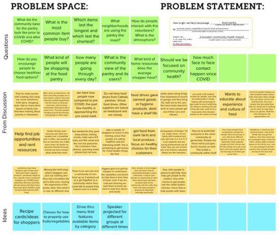 During the hackathon, instructors intentionally blurred the lines between ideation and prototyping (those are usually separated as distinct steps of the design process for novice learners) and encouraged hacking. Figure 7 provides an example of the solution idea prototyped graphically in Mural addressing a problem of promoting food pantry in the community beyond just food.
