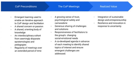 Summary of what this study has identified as the effective CoP preconditions, e.g., approaches to CoP design, group configuration, features of the CoP meetings including how meetings were run by facilitators and experienced by participants, and ultimately the realized value experienced by participants.