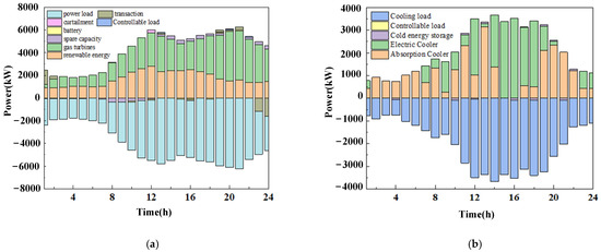 In Equation (18), is the daily operation and maintenance cost of the internal energy equipment in the MEG, USD. is the unit power operation and maintenance cost of the energy equipment, USD/kWh. is the electrical power of the gas turbine σ, kW; is the heating power of the waste heat boiler σ, kW. is the heat power of the gas boiler τ, kW. is the heat exchanger power, kW. is the absorption chiller power, kW. Finally, is the power of the electric refrigerator, kW. and are the battery charge and discharge power, kW. and are the heating power of heat energy storage, kW. and are the cooling power of ice energy storage, kW.