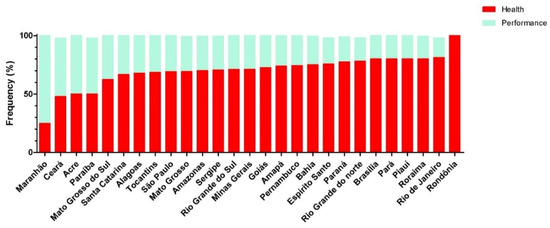 Figure 1 presents the frequency of running motivation by state of residence. Athletes from Maranhão were those with the highest percentage of subjects who pointed performance as their main motivation, followed by Ceará and Acre. On the other hand, athletes from Roraima, Rio de Janeiro, and Rondônia most frequently reported health as the major factor associated with running practice.