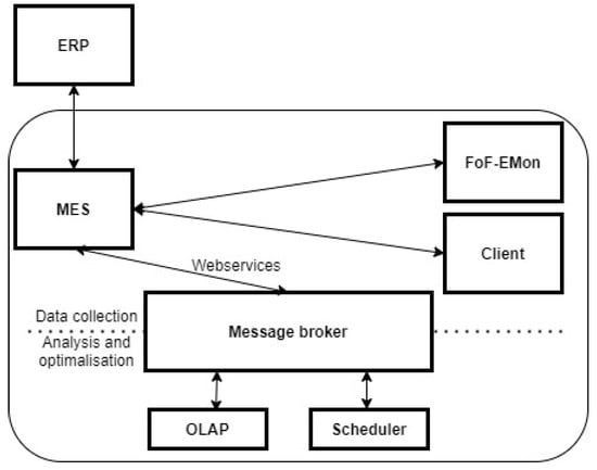 Other approaches are represented by the smart manufacturing execution system (SMES), focusing on the elimination of machine-to-human and human-to-machine interfaces to retain the existing manufacturing execution system (MES) resources []. The MES acts as a centre point for data collection in order to keep the existing structures of the company intact (see Figure 1). A message broker element ensures both-sided communication between the components []. A further difference between MESs and SMESs is that MESs focus mostly on management support, while SMESs work in a broader range in supply chains []. A service-based SMES approach has been proposed for SMEs using an Android-based interface in order to reduce the widely existing paperwork in these companies [].