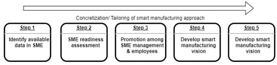 - Due to the realities of SMEs, researchers have come to the conclusion that SMEs are working in a small-scale and downsized environment []. Due to the broad bandwidth of these companies and their specialization, the approaches in smart manufacturing should also be tailor-made around a standardized core []. Being closely related to the companies’ strategic setup, the aim of this step is to boost the level of data from a mere data acquisition to a data distribution, allowing for data-based decision making []. Industry 4.0 and smart factories as an approach are striving for making use of a broad base of data gathered, processed, and distributed in order to allow for fast decision making [].