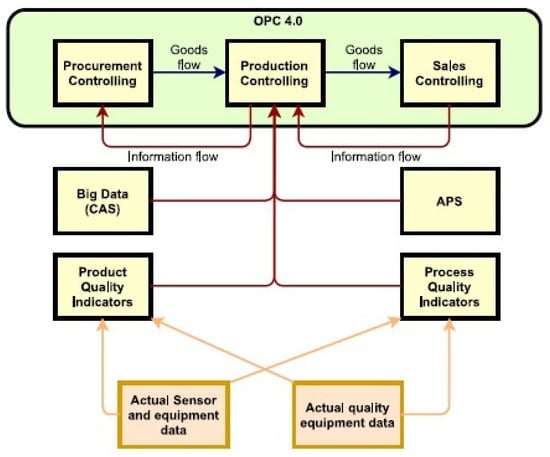 As OPC 4.0 is only the operative part of the controlling structure, higher-level controlling functions have to be covered additionally for LEs. Heimel and Müller assume the big data technologies to be a vital part of the strategic controlling []. Big data has the ability to consider not only internal standardized information but also information from external sources. Technologies such as text mining retrieve their data from any text found providing information, e.g., for marketing purposes that are required to be timely []. However, for an SME, the downsized framework for SMEs will work with a CAS instead of a BI and further big data technologies due to its limited complexity. The CAS contains standard process information for production, maintenance, and further processes. Such downsized architectures are represented by SMES frameworks. For the case study in this paper on a medium-sized company, the OPC 4.0-based SMES architecture, as developed in Figure 5, is used.