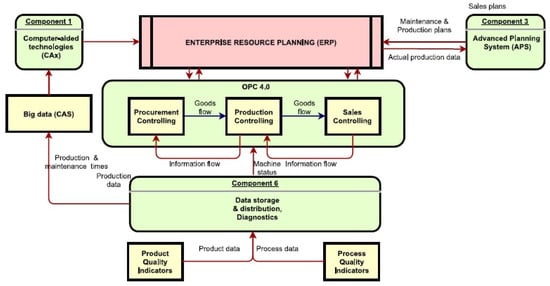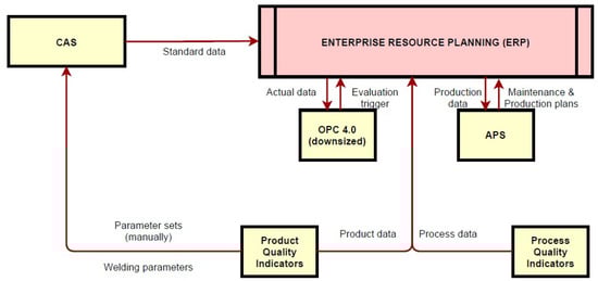 SMES models try to make use of ERP systems and the existing components of the information system architecture. The information system architecture components are linked through M2M communication. Industry 4.0 and smart concepts are assumed to depend on the quality and quantity of data in the company []. While Industry 4.0 approaches suggest big data to deal with a higher amount of data in a higher resolution, data today are still retrieved from various interdependent systems []. As companies make use of various systems today, high-level data for management decisions may be found in the ERP and MES system [], while operative data may be handled in lower-level information systems for operative controlling. In production companies, this refers to the production organization and planning and requires production indicators for input (resource usage) and output (productivity, quality) [].