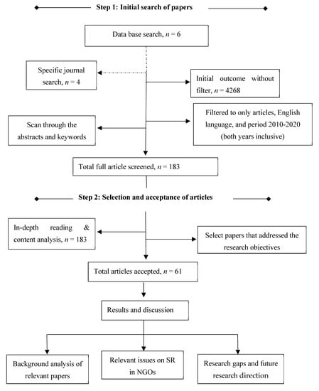 This review covers a decade, from 2010 to 2020 (both years inclusive). The review started from 2010 because of the triggering effect of the 2008/2009 financial crisis on organisations coupled with the extensive promotion of GRI frameworks in the year and subsequent publication of GRI and ISO 26000 aimed at espousing the use of GRI guidelines in combination with ISO 26000 in promoting transparency and sustainability in addition to the release of NGO GRI sector guideline in the same year [7,73]. Secondly, since the focus was on contemporary research, we believe that the last decade was enough to reveal trends and show a good assessment of existing research [74,75,76] as well as giving direction for future research. The first database search was performed in December 2018 while the last search was launched in August 2021.