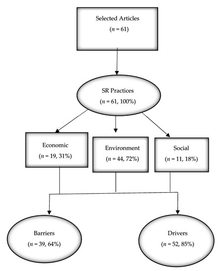 A content analysis was conducted on the selected articles and coded into NVivo to quantitatively analyse the content characteristics while eliminating the information source. The exploratory components were extracted, critically appraised, and grouped in clusters each of which later became a theme in line with [55,62]. This exercise was painstaking and common for document analysis where quantitative analysis of document characteristics is conducted. A systematic reduction process was inductively used to create and recreate categories and sub-categories in the selected articles using feedback loops in line with [52]. This process was also used to identify themes and classification of articles. The articles were further analysed manually to identify certain consistencies and inconsistencies within them. The core classification of the articles was first into “environmental”, “economic”, and “social & governance” because articles on these topics tend to discuss sustainability in a holistic way. Other aspects of the classification include “SR practice”, “barriers”, “drivers” (Figure 2) in order to cover the research question. Another important part of the articles was analysed and coded separately and then compared with others. An example is the SR driver (Table 4) and barriers (Table 5).