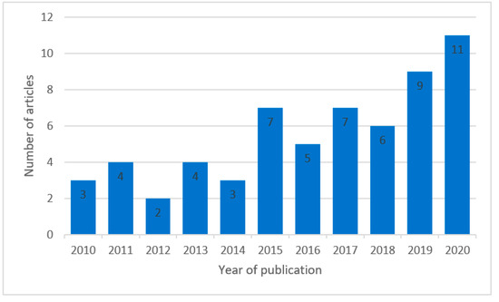 In order to show a trend in research on SR in NGOs, the number of publications studied per year is graphically presented in Figure 3 above. The result indicates that SR in NGOs was discussed more in 2020, and equal in 2015 and 2017 with seven articles as compared to fewer articles in the previous years. Publication on the topic was relatively the same between 2010 and 2014 before it seemed to have gained considerable attention in 2015 with about a 57% increase from the previous years; this trend continued until 2018 when publications declined by 16% but rose again in 2019. This growth may not be unconnected with the GRI’s launch of “Forward Thinking Future Focus” in December 2014 which was a combined activity review covering 2013 and 2014 and the subsequent landmark climate change agreement where 193 United Nations (UN) member states unanimously adopted 17 sustainable development goals and the promulgation of the European Union’s (EU) directive on disclosure of non-financial and diversity information in 2015 [73,76]. The trend shows that SR is a growing phenomenon in NGOs though not without some challenges in its development. The trend reveals that, although there was low interest in the subject in the beginning, it grew over time as its relevance is espoused, however, further analysis to prove this will be conducted in the subsequent section.
