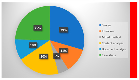The relevant papers analysed show six dominant research methodologies used by existing studies on SR. These are survey, interviews, mixed-method, content analysis, document analysis, and case study research. Figure 5 shows that survey and case study research methods are the most frequently used method for investigating SR, accounting for 29% and 25%, respectively. This finding appears consistent with the need for robust empirical evidence to argue the narratives and policy development on SR in the third sector and validate theoretical underpinning of the relevance of SR in the sector [78,86,87,88]. Having been used by 20% of the surveyed articles, content analysis was the third most frequently used method. This is consistent with [39] findings, that content analysis gives a clear picture of the situation. Using a content analysis explored how organisations manage their SR process; they specifically focused on internal factors associated with SR [41,54]. The results show that, although they are ranked top in the scheme, the sequence of structures, systems, and processes in which SR is managed varies across organisations. The next most used methods, according to our survey, are interview and document analysis with 11% and 10%, respectively. Again, this is consistent with [14,15,43] who used interview analysis for examining beliefs about the motivations for NGOs in joining the international NGO (INGO) charter because of its ability to explore perspectives and show trends. The findings support the constructivist explanation of NGO behaviour. This shows that survey research, to an extent, gives a detailed explanation of a phenomenon. Mixed-method is the least adopted method in connection with SR with 5%. This suggests that mixed-method comprising survey research (quantitative) complemented with an interview (qualitative) may be a relatively new concept in this area or its use may not be very well known/understood. However, given that survey and interview methods were independently highly used, a combination of the two (mixed-method) could provide a more balanced view and a nuanced explanation of a phenomenon, and hence is to be recommended. This view aligns with those of [89,90] who support the use of mixed-method and aver that it is ideal in social science research because it provides a comprehensive empirical description of the phenomenon being investigated.