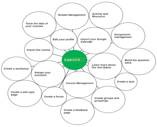 iLearn is an online assistant first launched in 2000. It was used in university courses to integrate technology with education in line with the SLE approach [23]. In 2015, the iLearn system was upgraded and migrated to the iLearn 2.0 version. The upgraded platform continues to use “Internet Classroom”. The platform has been also used by businesses for distance learning and for conferencing, the same as Kahoot [44]. The system of iLearn 2.0 module is Moodle. The main change of iLearn2.0 is that teachers can design the teaching plan more flexibly, and the new platform presents a single page. The method is closer to social network models, increasing the affinity of students [45]. In this platform, to meet the users’ demands, the teaching resource center re-examines and plans the functional blocks, resource classification and layout of the online classroom, re-courses, university class tools, and other modules so that users can find the resources they need to use more easily. In the iLearn2.0 operation interface, the basic functions include (see Figure 1).