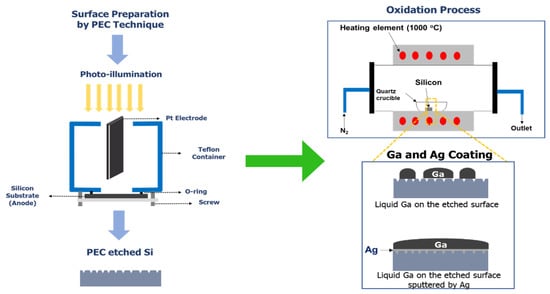 Schematic representation of fabrication and oxidation processes of the silicon substrate and gallium, respectively, including the PEC etching process. Both patterned silicon surface, i.e., with and without a Ag catalyst, were coated with Ga and oxidized at 1000 °C in N2 gas for 1 h.