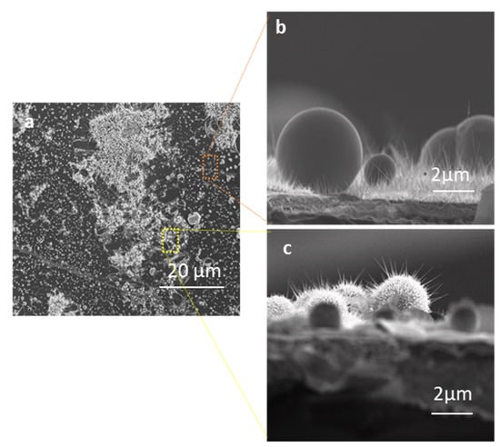 Figure 2 shows the SEM images of gallium oxide on silicon together with two cross-sectional views of the spots marked in the top view image. The Ga–Si phase diagram shows an eutectic at 99.994 at.% Ga and 29.7 °C [40]. Heating the Ga–Si system at 1000 °C and then cooling to room temperature results in droplets formed through melting and dewetting at the eutectic temperature. Due to the dewetting effect of liquid Ga on the Si surface, the coverage of the Ga2O3 nanostructures was not homogenous, as shown in Figure 2. Some Ga drops tend to form small droplets in the range of 1 µm on the surface of silicon and not wet it. Ga has high surface tension and does not wet hydrophilic-like surfaces such as silicon. The SEM observation of Ga nanospheres presented in Figure 2b,c suggests a large contact angle (α) close to 180°, which corresponds to low wettability. Under the presence of a small amount of oxygen, some of these Ga nanospheres are oxidized and transformed into nanowires (Figure 2c); however, some of them remained as perfect liquid Ga spheres in the range of 1 to 2 µm (Figure 2b).