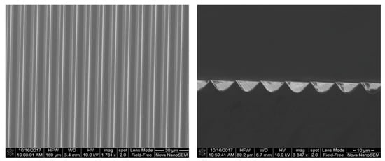 SEM images of groove-shape structures on silicon surface (top view, (left)) and side view (right) of the Si substrate after PEC etching.