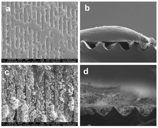 Although Figure 4a suggests that gallium melts and forms melted-like patches on the PEC-etched Si surface, Figure 4b shows that, actually, the liquid gallium does not enter the grooves in the absence of a Ag catalyst. In addition, the liquid gallium oxidation does not take place completely, and the modified surface texture of the silicon actually supports the liquid Ga and does not allow it to enter the grooves in such condition as shown in Figure 4a,b. By comparison, a major change in the growth morphology of Ga2O3 nanostructures was observed in the presence of a Ag catalyst, where an increase in the wetting property of liquid Ga was observed. Due to the catalytic action of the Ag layer, Ga2O3 was grown inside the grooves of the PEC-etched silicon surface (Figure 4c,d), where there was a conformal Ag layer. In the presence of a Ag catalyst, a dense growth of nanowires was observed on the top surface and inside the grooves (Figure 4d).