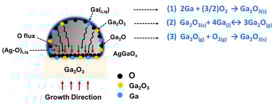 In the first step, liquid gallium oxidizes at the surface of silicon substrate to form gallium (III) oxide (Ga2O3) (Equation (1) in Figure 5) [41,42]. In the second step, the Ga2O3 solid phase interacts with the gallium liquid phase to form the gallium suboxide (Ga2O) gas phase (Equation (2) in Figure 5) [43]. In the third step, the Ga2O vapor phase breaks down into liquid Ga and Ga2O3 in the presence of oxygen (Equation (3) in Figure 5) [44,45].