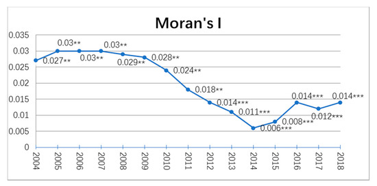 Figure 3 shows the results of the global Moran’s I index of lnec. The Moran’s I fluctuated from 0.006 to 0.03 at the confidence of 5% or 10% during the period of 2004–2018. It means the existence of a significant positive correlation with the spatial distribution. The dynamic changes of the index reflect the weakness or strengthens of the spatial agglomeration. From 2005 to 2014, the Moran’s I had a substantial decrease, but it gradually increased after 2014, except for a slight decline in 2017. Therefore, it is clear that the spatial autocorrelation became weaker gradually between 2005 and 2014, but it increased after 2014.