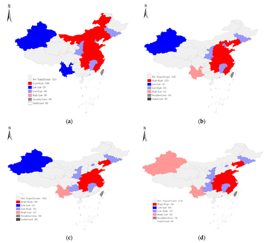 Local Moran map of electricity consumption. (a) 2004; (b) 2008; (c) 2012; (d) 2018.