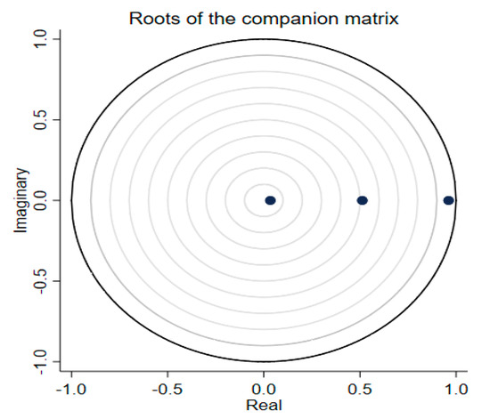 Checking the stability conditions is essential when estimating the PVAR model. Whether the PVAR is stable depends on the modulus of each eigenvalue of the estimation model. If each modulus in the companion matrix is strictly less than one, the PVAR model is stable [54]. Figure 5 confirms that the estimated PVAR model satisfies the stability condition.
