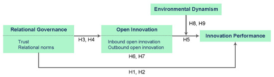 Moreover, studies of open innovation have not investigated the effect of environmental dynamism on the association between inter-organizational collaboration and firms’ innovation performance. In practice, open innovation is always disturbed by changes in technology and market demands, and exchange parties should quickly alter their expectations and strategic decisions as a result [34,35]. Environmental dynamism will not only produce uncertainty and exchange hazards but also increase the difficulty for firms to monitor or control the behaviors of external partners [36,37]. However, the literature has only briefly considered the important role of relational governance in avoiding the risks of open innovation from the perspective of inter-organizational collaboration, but it has failed to explore the contingency factors of relational governance [11,32,38]. Thus, we argue that the inclusion of environmental dynamism as a moderator variable may clarify the role of relational governance in open innovation.