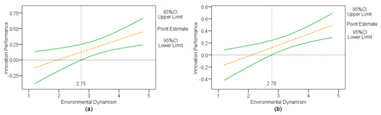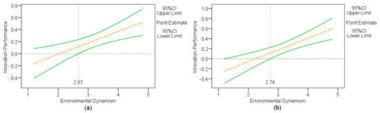 To fully investigate the moderating effect of environmental dynamism, we used the Johnson–Neyman approach suggested by Preacher et al. [82] and plotted the results in Figure 2 and Figure 3. As shown in Figure 2a,b, the results revealed that inter-organizational relational governance (trust and relational norms) demonstrated stronger indirect effects on firms’ innovation performance when environmental dynamism was higher than 2.67 or 2.74. The results, found in Figure 3a,b, suggested that trust and relational norms demonstrated stronger indirect effects on firms’ innovation performance when environmental dynamism was higher than 2.75 or 2.78. Thus, H9 was further supported.