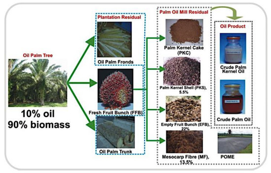Figure 1. Plantation and palm oil mill residual in production of crude palm oil from biomass. Adapted with permission from Salman Zafar (2018) [31].