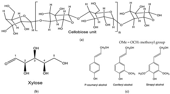 Figure 2. Chemical Structure of (a) cellulose component: Cellobiose. Adapted with permission from Mohd Azri Sukiran (2008) [69]; (b) hemicellulose component: xylose and (c) lignin components: P-coumaryl alcohol, coniferyl alcohol and sinapyl alcohol. Adapted from [70] (OA).