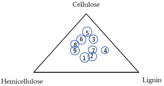 Figure 3. Ternary plot of cellulose, hemicellulose, and lignin in other types listed in Table 4.
