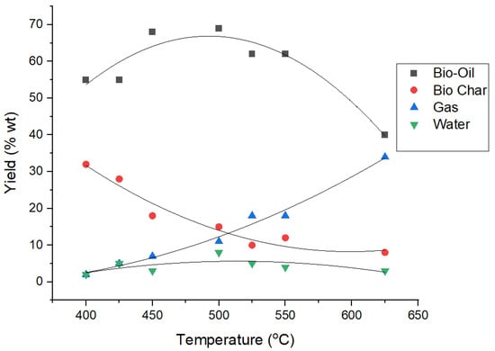 Figure 4. Effect of pyrolysis temperature on yield of pyrolysis products (using Origin Lab). Adapted with permission from John Tustin (2006) [111].