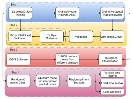 In this study, the effect of the angle variations of the structure toward the horizon on the received energy and the variation of power plant capacity in different regions of Iran in two different scenarios have been investigated. The first scenario examines the optimum (variable) time intervals to change the angle, and the second scenario considers the fixed time intervals. For this purpose, the studied area must be classified into different regions in terms of solar radiation intensity. Next, studies related to the variation of solar energy intensity reached to the panel surface and the power plant capacity have been conducted. Figure 1 shows the conceptual structure of the study.