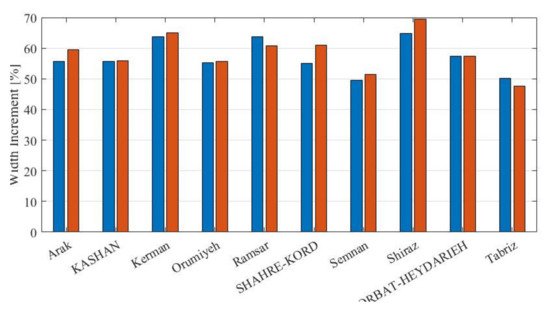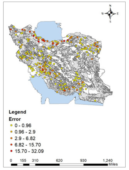 In the next step, the error of trained data was computed. As shown in Figure 5, the average error was lower than 2.2 percent, and a large part of these errors were due to the topological condition. Regions between different climates cannot be predicted well. This is because of the low amount of training datasets for those regions. Those regions’ areas are small compared to the whole area of Iran; hence, this error can be ignored (Figure 6).
