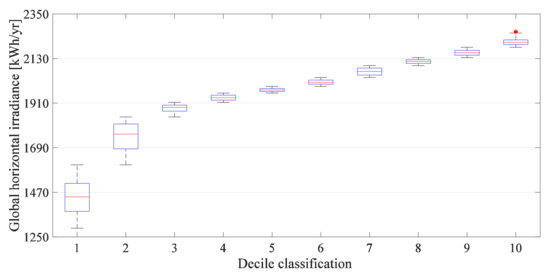 According to the amount of solar energy potential, the share of solar radiation in each decile has been devised. This decile classification is based on global horizontal irradiance (Figure 7).