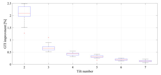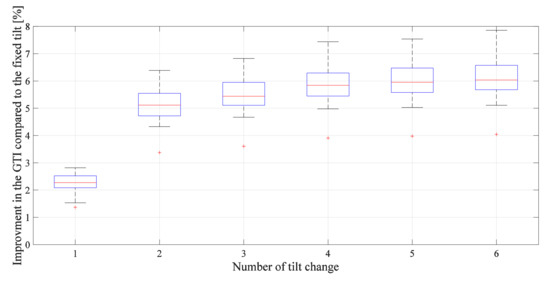 Since the mounting system can be adjusted manually, the number of angle changes is expected to be limited. Figure 8 shows the effect of the number of angle changes per year on increasing the amount of global tilted irradiance (GTI) or input energy.
