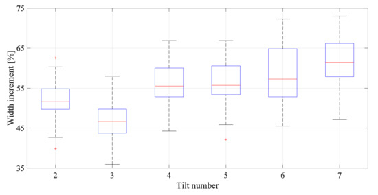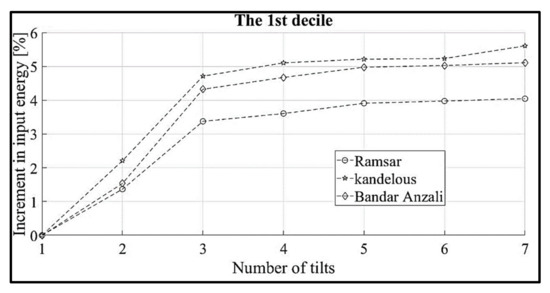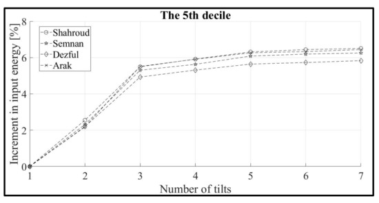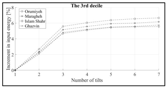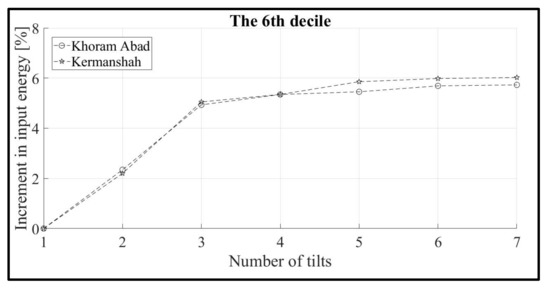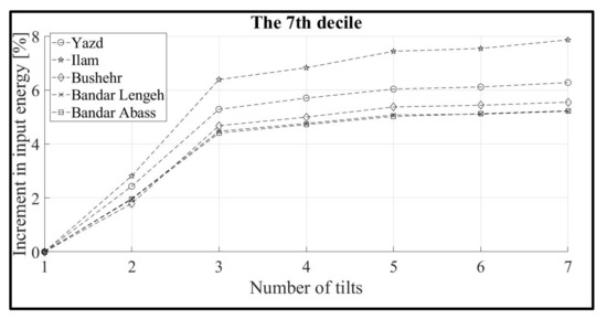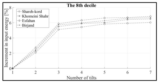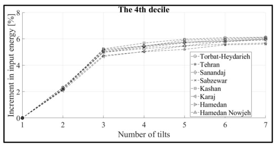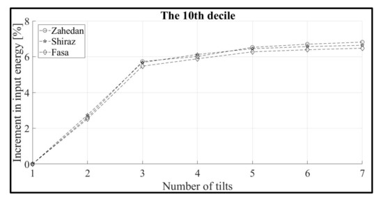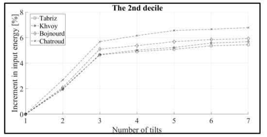 3.2. Effect of the Angle Variation and Solar Radiation Decile on the Amount of Input Energy Increment
