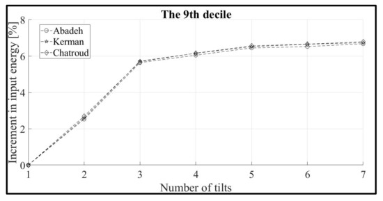 Figure 9, Figure 10, Figure 11, Figure 12, Figure 13, Figure 14, Figure 15, Figure 16, Figure 17 and Figure 18 show the effect of the number of angle changes on the input energy to the panel surface increment in each decile.