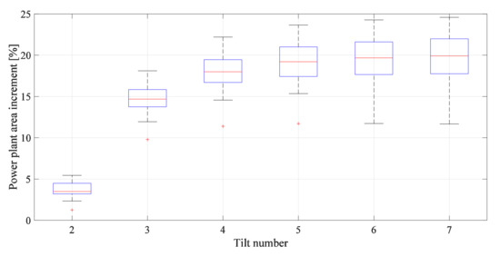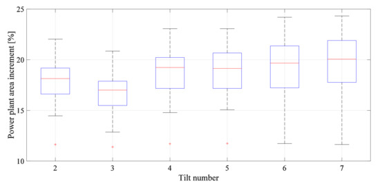 Although the use of a solar tracker increases the input energy to the energy conversion technology, it causes the distance among the rows of the solar panels to increase, which reduces the capacity of the solar panel per unit area. Therefore, the use of this solution will be only in cases where the shortage of land is no problem. Figure 20 and Figure 21 show the increase in the distance between the rows of the solar panels as a function of the number of angle changes per year for the 40 case studies.