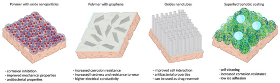 In the initial time of their applications, nanotechnology and nanostructures were regarded as having only positive effects in many fields, but after the initial period, when more knowledge had been accumulated, especially regarding the impact on health, the merits and demerits were better understood [132,133]. In the coatings world, the nanostructures benefits were exploited successfully, enhancing performance and functionality in many domains, introducing more stability and corrosion resistance in various aggressive environments, including bioliquids. A better cell response, as well as more adhesion and better mechanical properties [134,135,136] were obtained via more green coating fabrication methods. Some multifunctional coatings that are discussed in more detail below are presented in Figure 2.