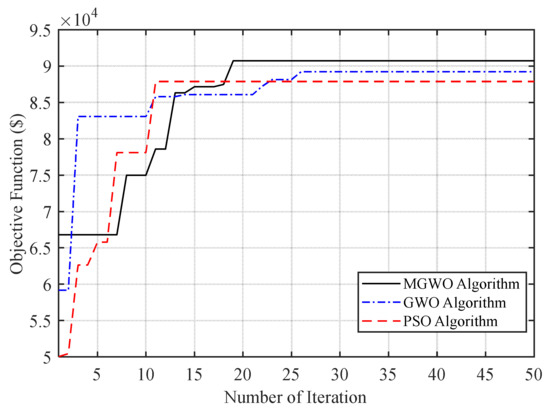 Table 6 shows the storage values in this case. As can be seen from Table 6, the units that produced less power played a greater role in providing system storage. The final value of the objective function in this case is about $90,718. The convergence curves of the algorithms are shown in Figure 2.