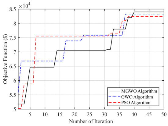 As can be seen from Table 8, units 1 and 2, which are among the cheapest units, produced their maximum power at almost all hours. The final profitability in the case of uncertainty was $84,364. Similar to the previous section, the PSO algorithm and GWO algorithm are used for optimization. The convergence curves of the optimization algorithms are shown in Figure 3.