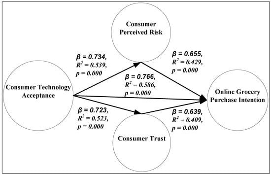 Further, the indirect impact of consumer acceptance of technology on online grocery purchase intention via consumer perceived risk and consumer trust was calculated. The results indicated that the impact of consumer acceptance of technology on consumer perceived risk was found as significant (F = 515.215, t = 22.696, p = 0.000) and contributed 53.9% (R2 = 0.539) to online grocery purchase intention. The results revealed that the beta value for factor of consumer acceptance of technology is 0.734 and it has significant effect on consumer perceived risk associated with online shopping. Hence, the research hypothesis is accepted indicating that impact of factors of consumer adaption of technology on consumer perceived risk was fond significant. The impact of factors of consumer acceptance of technology for purchasing grocery online on consumer trust was found significant (F = 483.375, t = 21.986, p = 0.000) and contributed 52.3% (R2 = 0.523) to consumer trust. The results revealed that the beta value for factors of consumer adaption of technology is 0.723 and it has significant effect on consumer trust. Hence, the research hypothesis is accepted indicating the consumer acceptance of technology has significant effect on consumers’ trust.