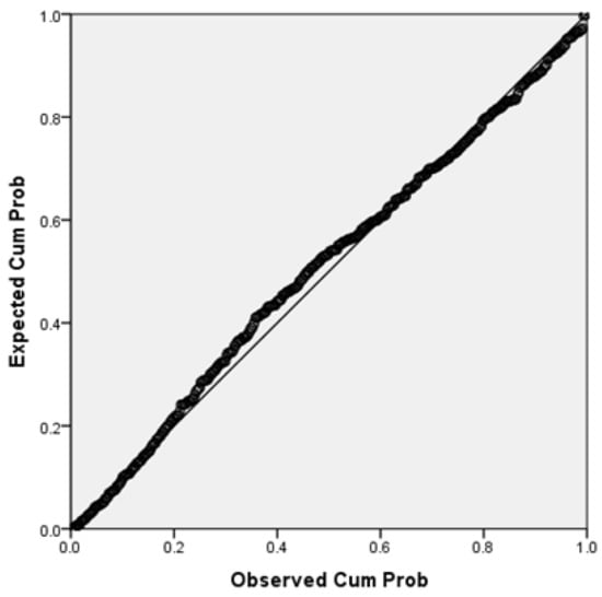 Further the impact of consumer risk perception on online grocery purchase intention was tested and found significant (F = 331.090, t = 27.871, p = 0.000) and contributed 42.9% (R2 = 0.429) to consumer online purchase intention. The results revealed that the beta values consumer trust is 0.655 and it has significant effect on consumer online purchase intention. Hence, the research hypothesis is accepted indicating the consumer perceived risk has significantly influence on consumer online grocery purchase intention. The impact of consumer trust on online grocery purchase intention was found significant (F = 305.030, t = 17.465, p = 0.000) and contributed 40.9% (R2 = 0.409) to consumer purchase intention. The results revealed that the beta value of consumer opinion is 0.639 and it has significant effect on consumer grocery online purchase intention. Hence, the research hypothesis is accepted indicating the consumer trust has significant effect on consumers’ online grocery purchase intention. Note that, the normal probability test was carried out with the help of SPSS software for assessing whether a data set is approximately normally distributed. SPSS automatically gives a normal probability plot, specifically a P-P plot. Normally a P-P plot is conducted to compare the observed cumulative distribution function (CDF) of the standardized residual to the expected CDF of the normal distribution. An inspection from the regression standardized residual (Figure 3) was also found to be normally distributed whereby the observed and expected values were found along the line, without any significant departures from it.