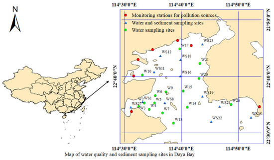 - Tang, H.; Ke, Z.; Yan, M.; Wang, W.; Nie, H.; Li, B.; Zhang, J.; Xu, X.; Wang, J. Concentrations, Distribution, and Ecological Risk Assessment of Heavy Metals in Daya Bay, China. Water 2018, 10, 780. [Google Scholar] [CrossRef] [Green Version]