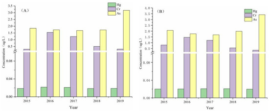 The average concentrations of Hg, Cr, and As in surface water samples over five years were 0.020, 0.78, and 2.03 μg/L, respectively. The average concentrations of Hg, Cr, and As in bottom water samples over five years were 0.020, 0.79, and 2.13 μg/L, respectively. Only a slight difference in HM concentration was found between the surface and bottom water samples. The level of HM concentrations in seawater is considered class I, based on the Sea Water Quality Standard (SWQS) of China (GB 3097-1997) [26].