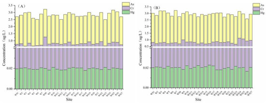 Hg concentrations were similar among the sampling sites (Figure 3). High As and Cr concentrations were mainly found in coastal areas (W3, W4, W7, WS8, W10, WS23, WS25, and WS27), which may be related to more frequent human activities near the coast. Water pollutants from domestic, industrial, and aquaculture discharges are the primary sources of HMs near the coast. The far coast is less affected by human activities. Daya Bay has a strong water exchange capacity, which can effectively dilute pollutant concentrations. Therefore, HM concentrations were significantly lower on the far coast [28].