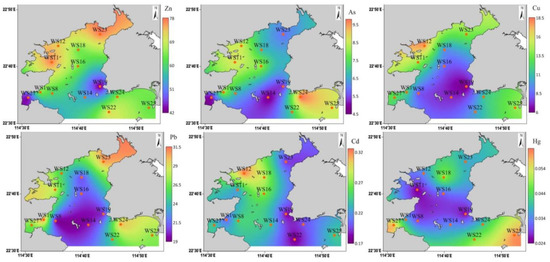 The spatial distribution profiles of HMs in sediments from Daya Bay are shown in Figure 4. Generally, the lowest HM concentrations were found in the southeast coastal area, whereas the highest concentrations occurred in the northern coastal area. The spatial distribution of HMs in Daya Bay is influenced by point sources, upwelling flow off the Guangdong coast [44], and clockwise circulation patterns of currents. The distributions of Pb and Zn displayed a similar pattern, with high concentrations at the northern sites. Extremely high concentrations of Pb and Zn occurred in Fanhe Harbor (WS23), which is surrounded by cage aquaculture. Yang et al. also found increased Pb and Zn concentrations in sediments from cage aquaculture areas [45,46]. High Pb concentrations were recorded near a nuclear power plant (WS1), which is an important source of HMs in Daya Bay [47]. High Pb concentrations were also recorded in Dapeng Cove (WS27), which is an area known to exhibit cage aquaculture. High concentrations of As were recorded in the eastern (WS24 and WS25) and western (WS11 and WS12) areas of the bay, with the highest concentration being observed at Fanhe Harbor. The concentrations of Cd and Cu exhibited a decreasing profile from north to south. The highest concentrations of Cd and Cu were recorded at the Yaling Cove (WS12), which was heavily affected by local runoff. The highest Hg concentration was recorded in Gangkou Harbor (WS25) possibly due to the domestic sewage discharge. Low HM concentrations were recorded at WS14 and WS19, with the outfall of the first sewage pipeline nearby; this result indicated that the HMs in sediments were not affected by the outfall.