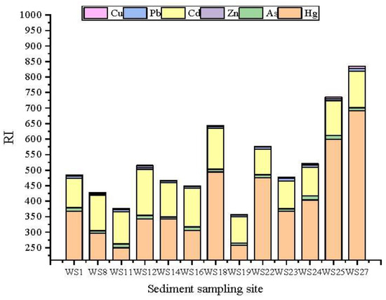 The average RI values for the sampling sites were ranked as follows: WS27 (834.92) > WS25 (735.41) > WS18 (643.58) > WS22 (577.16) > WS24 (520.7) > WS12 (515.15) > WS1 (485.09) > WS23 (477.88) > WS14 (466.29) > WS16 (449.78) > WS8 (427.37) > WS11 (377.22) > WS19 (356.64) (Figure 5). According to Figure 5, the RI value in Daya Bay was mainly influenced by Hg and Cd concentrations, which contributed more than 90% of the RI. Daya Bay generally exhibits a relatively high risk. W27, W25, and W18 showed high RI values (>600) and were classified as high risk (Figure 5). The RI values of the other sites were between 150 and 300, indicating a relatively high risk. Due to the high toxicity and high proportion of RI, Hg, and Cd played a very important role in the ecological risk evaluation in Daya Bay. Tang et al. [13] also found that Cd and Hg pose a very high risk in Daya Bay.