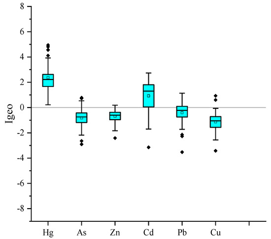 The Igeo values of HMs are shown in Figure 6. The Igeo values of As, Zn, Pb, and Cu were below zero, suggesting that Daya Bay was not polluted by these metals. For Cd, the Igeo value was between 1 and 2, suggesting “mild” pollution. For Hg, the Igeo value was between 2 and 3, indicating “moderate” pollution. The pollution status of Daya Bay as per the Igeo values is consistent with the results provided by the potential ecological risk index (Eir).